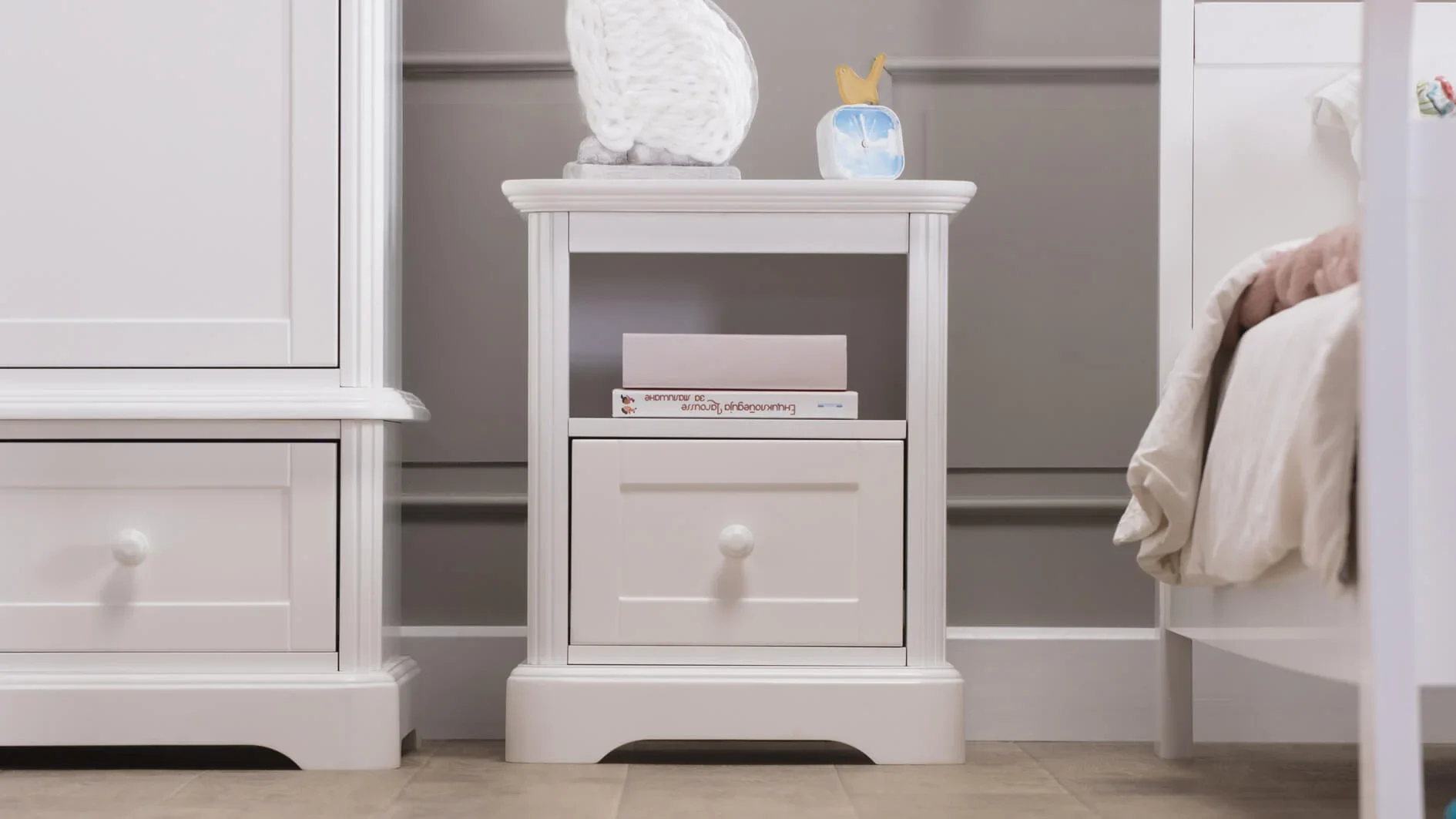 This bedside table in white matte color is made in the combination of chipboard and MDF. The drawer structure and the front part are made of white melamine chipboard. The structure plank top, the decorative base and the decorative moldings on the drawer are made of MDF coated with white primer foil.