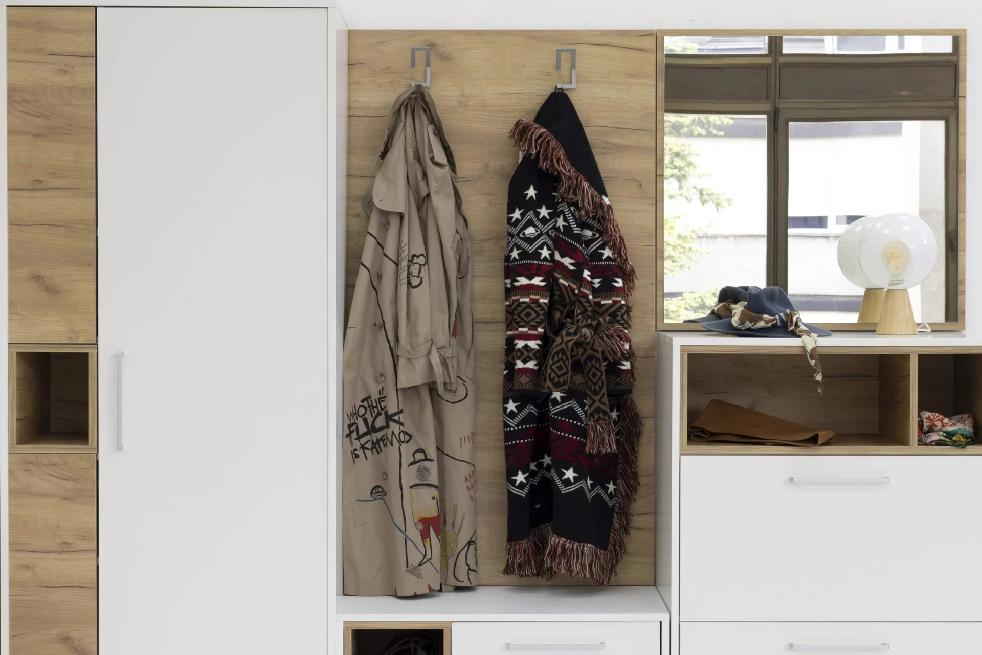 The Luna hat stand has three large and two smaller metal hangers, placed in two rows, on the panel made of MFC in the golden oak design. It brings warmth to the interior and adapts to any style of decoration. It is also suitable for furnishing catering establishments, offices, smaller waiting rooms, playrooms, etc.