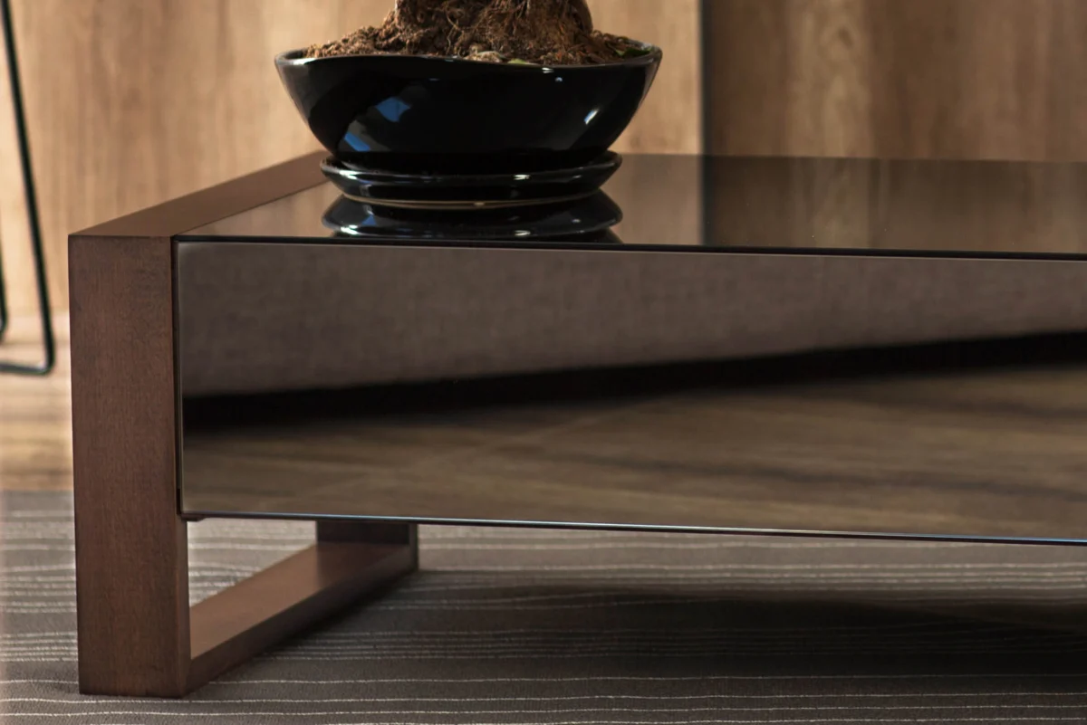 This club table of rectangular shapes covered with a tinted mirror that subtly reflects light, is a perfect decorative piece of furniture. Combined with chocolate-colored solid beech wood legs, it ennobles and makes your space unusual.