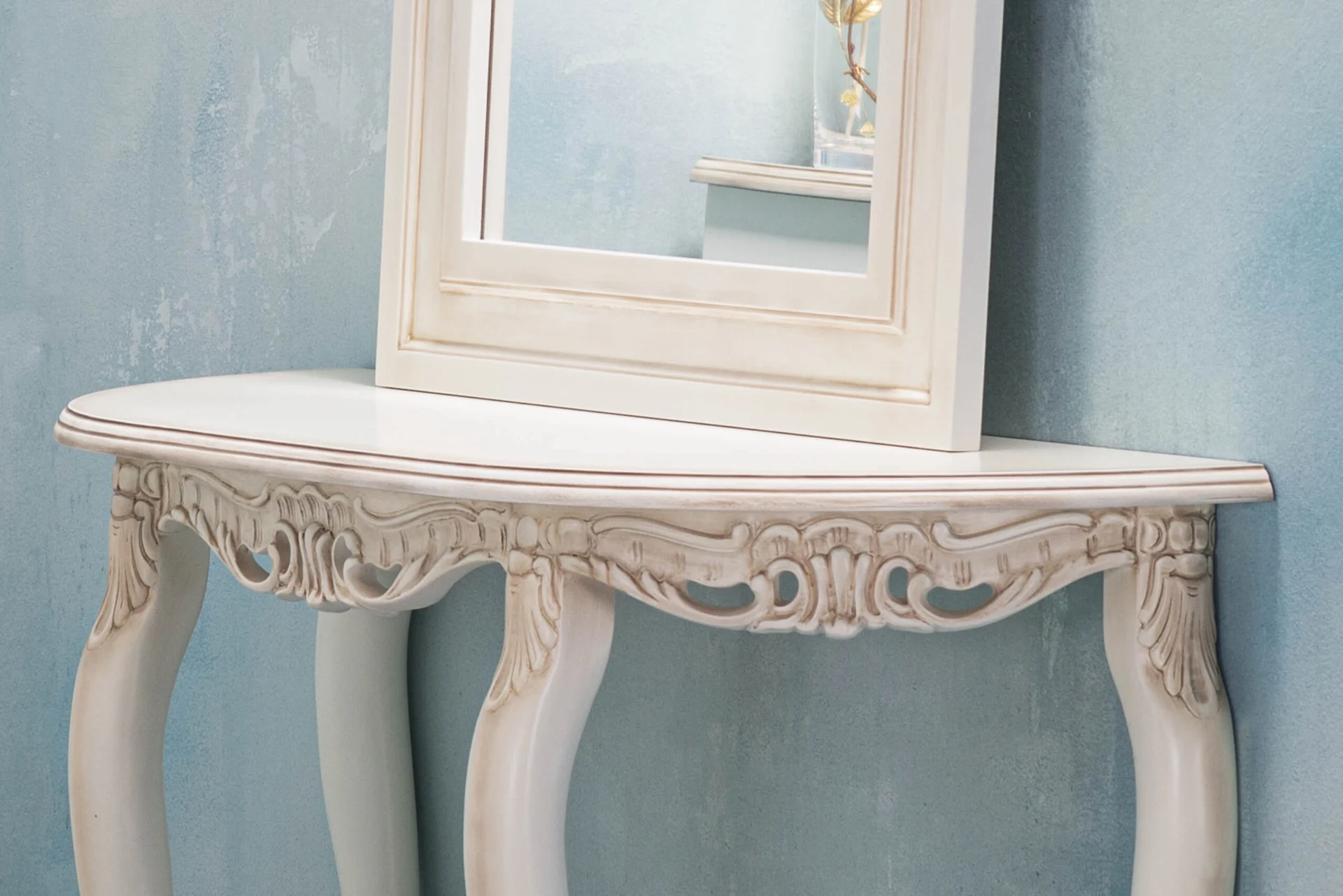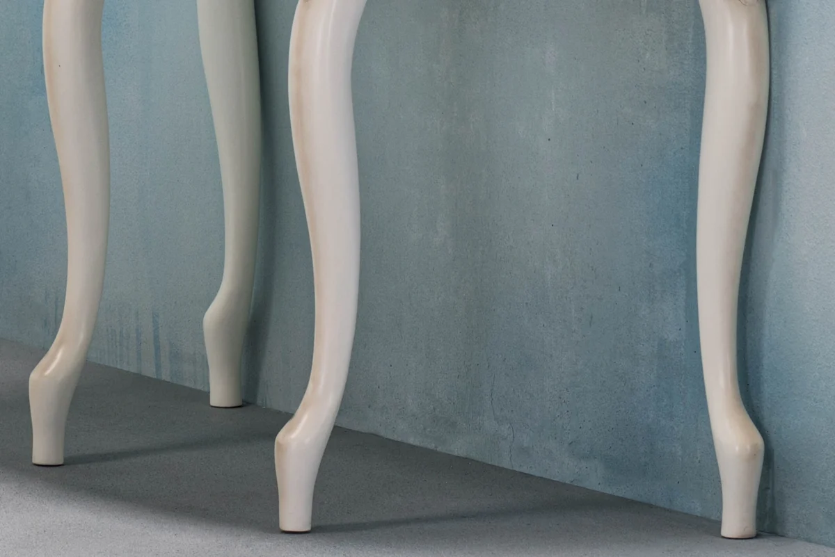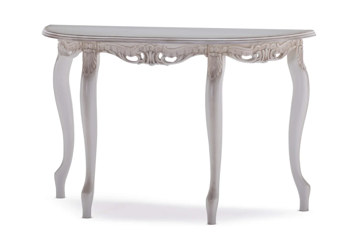 Viktorija konzola ima ploču od belog oplemenjenog medijapana, sa završnom obradom u beloj mat boji. Rubovi su profilisani i senčeni. Valovite noge od punog bukovog drveta, takođe su profilisane i senčene. Konzola je delo najfinije ručne dorade.