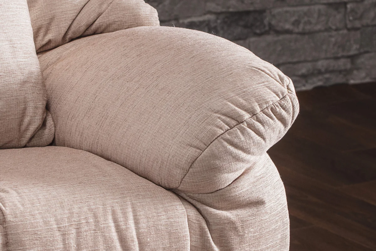 Iza prijatnog i nežnog izgleda ove fotelje nalazi se čvrsta konstrukcija napravljena od bukove rezane građe, šper ploče i iverice. Sve je obloženo standardnom poliuretanskom penom.